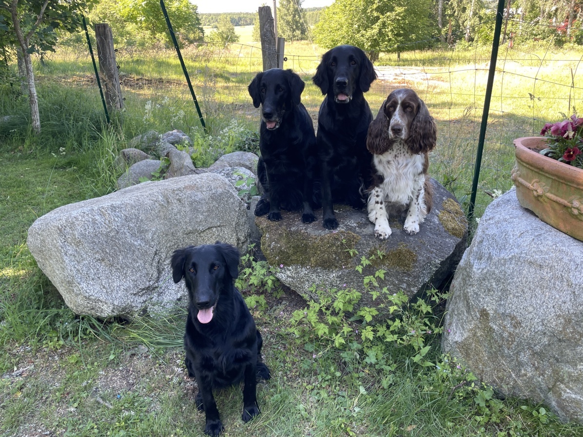 Leah, en Flatcoated retriever tik född 2017, Miri hennes dotter född 2020, Klara född 2022 och Inez en Engelsk Springer Spaniel tik född 2017.